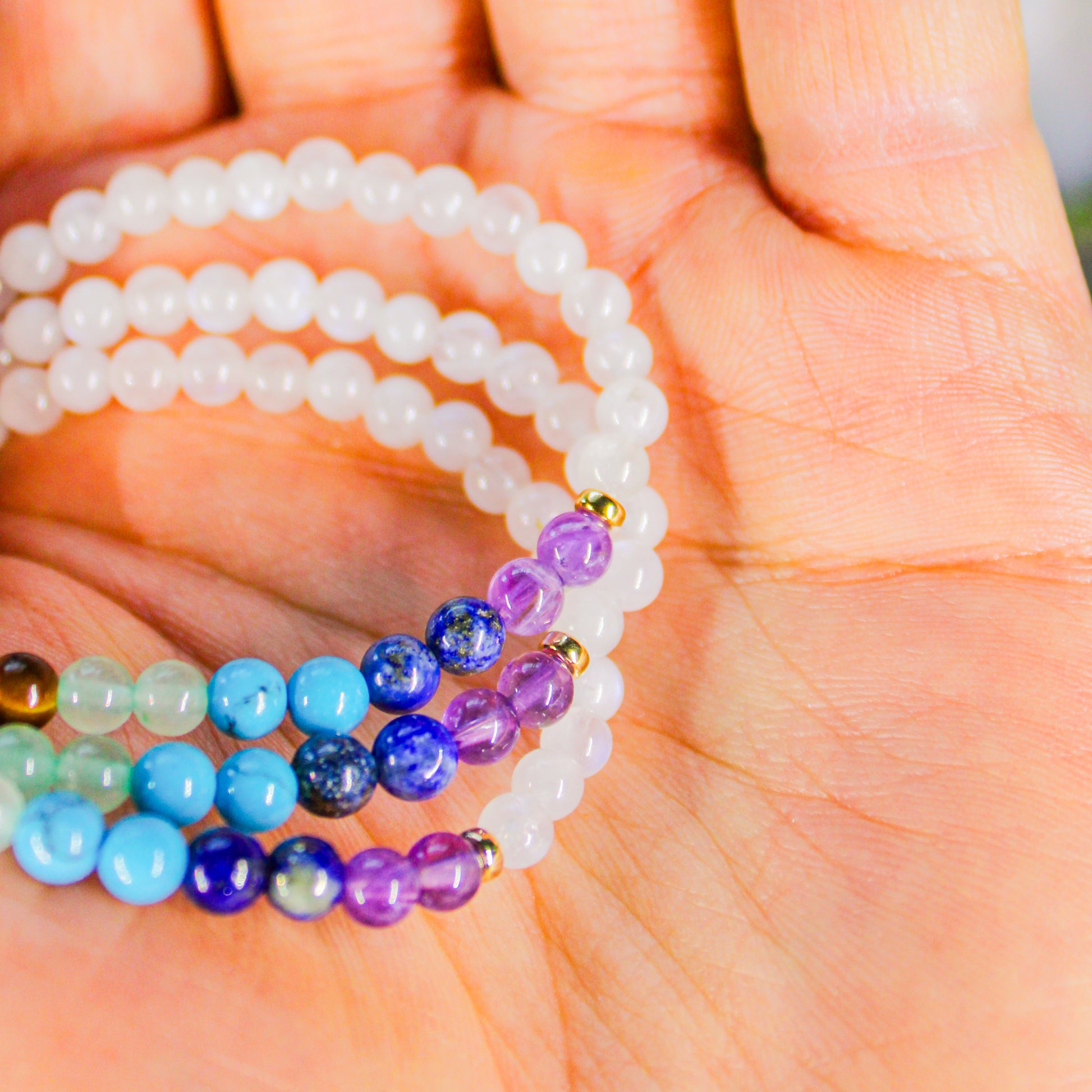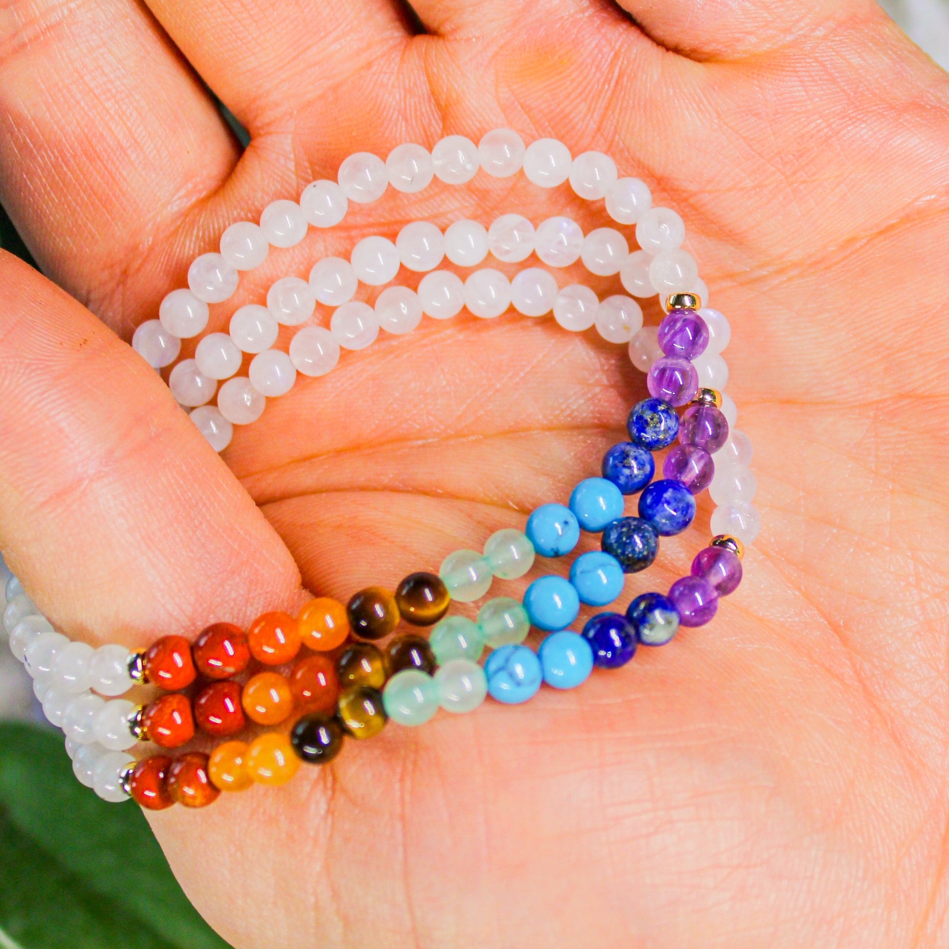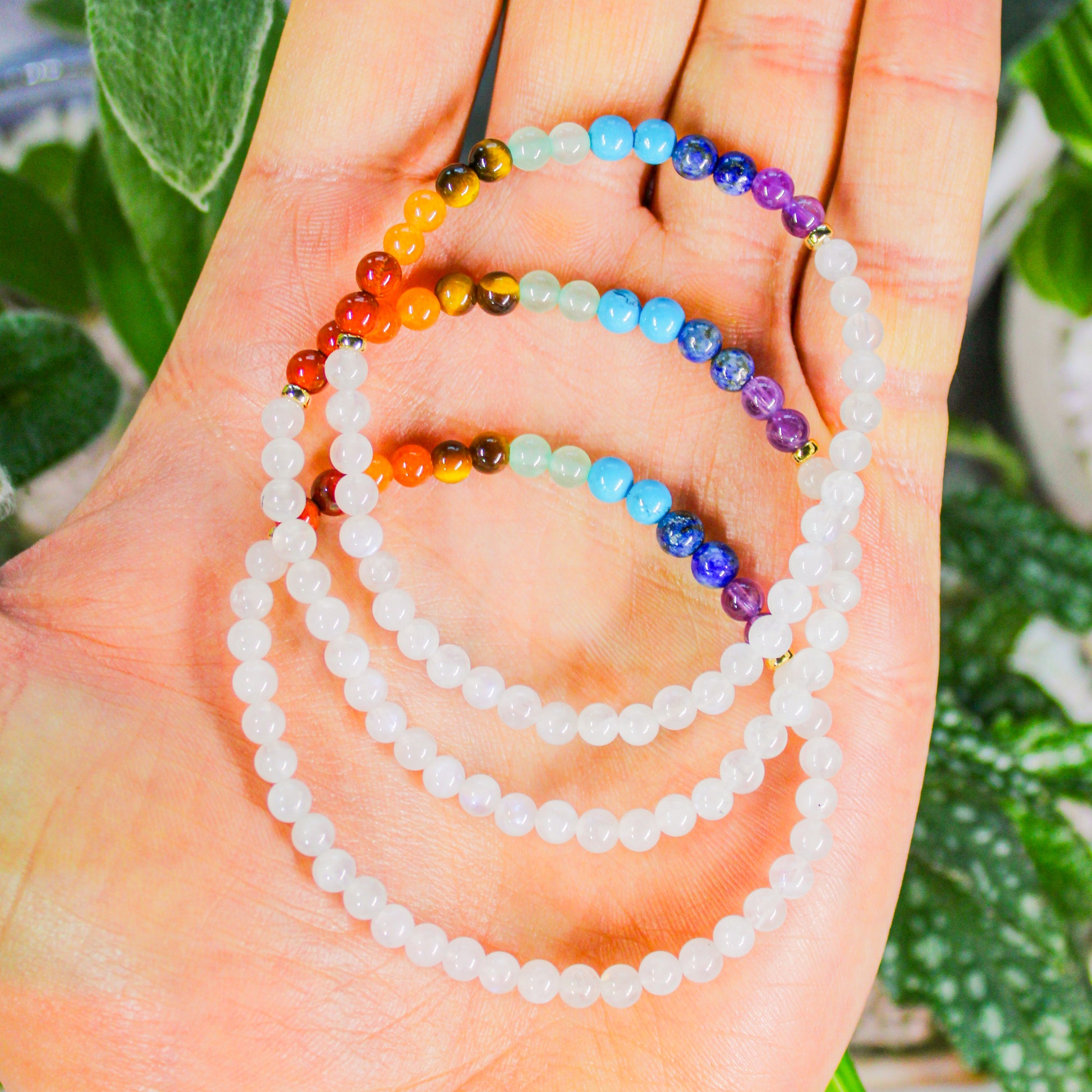 7 Chakra Healing Moonstone Healing Crystal Energy Bracelet with 4mm Natural Gemstones and 14K Gold-Filled Hypoallergenic Beads