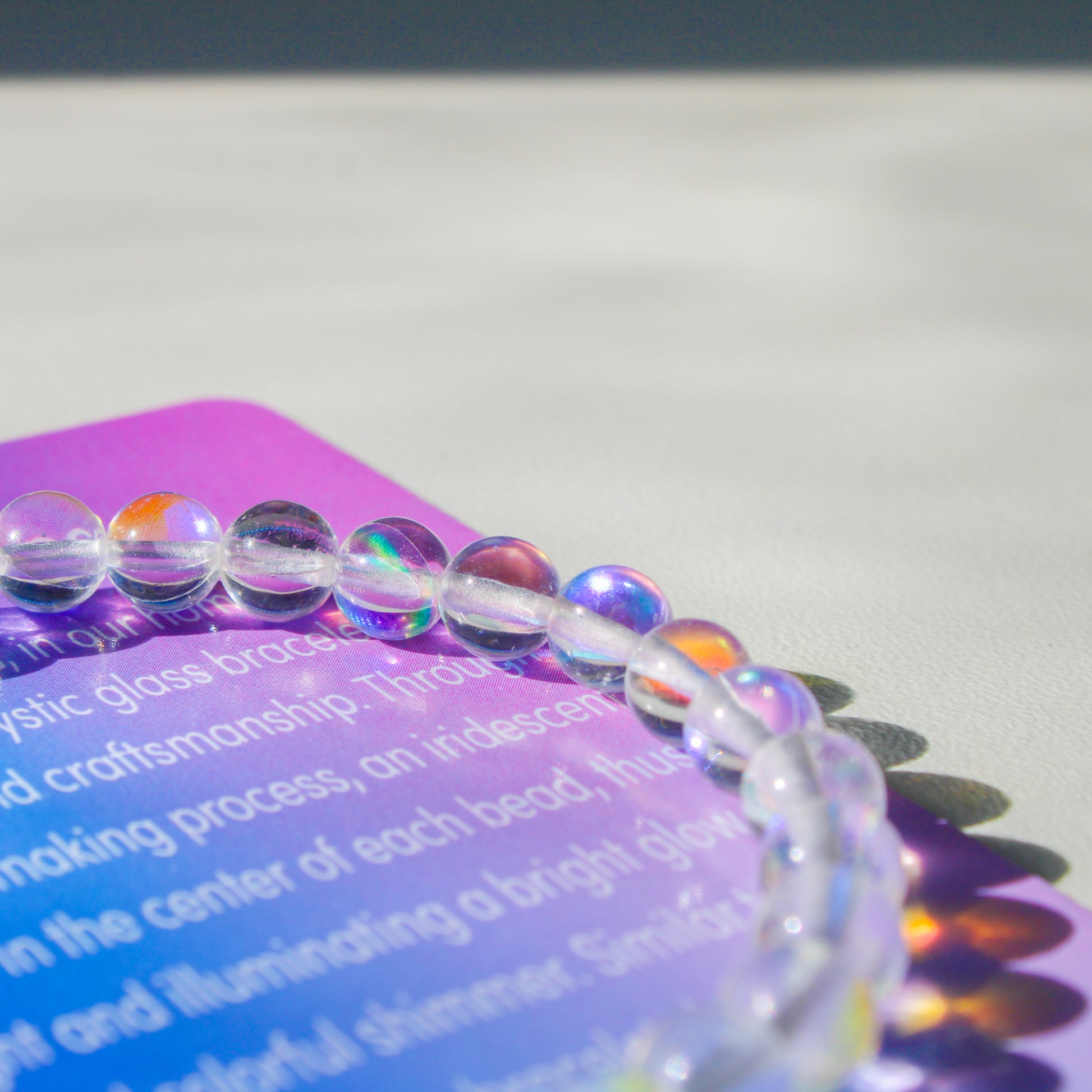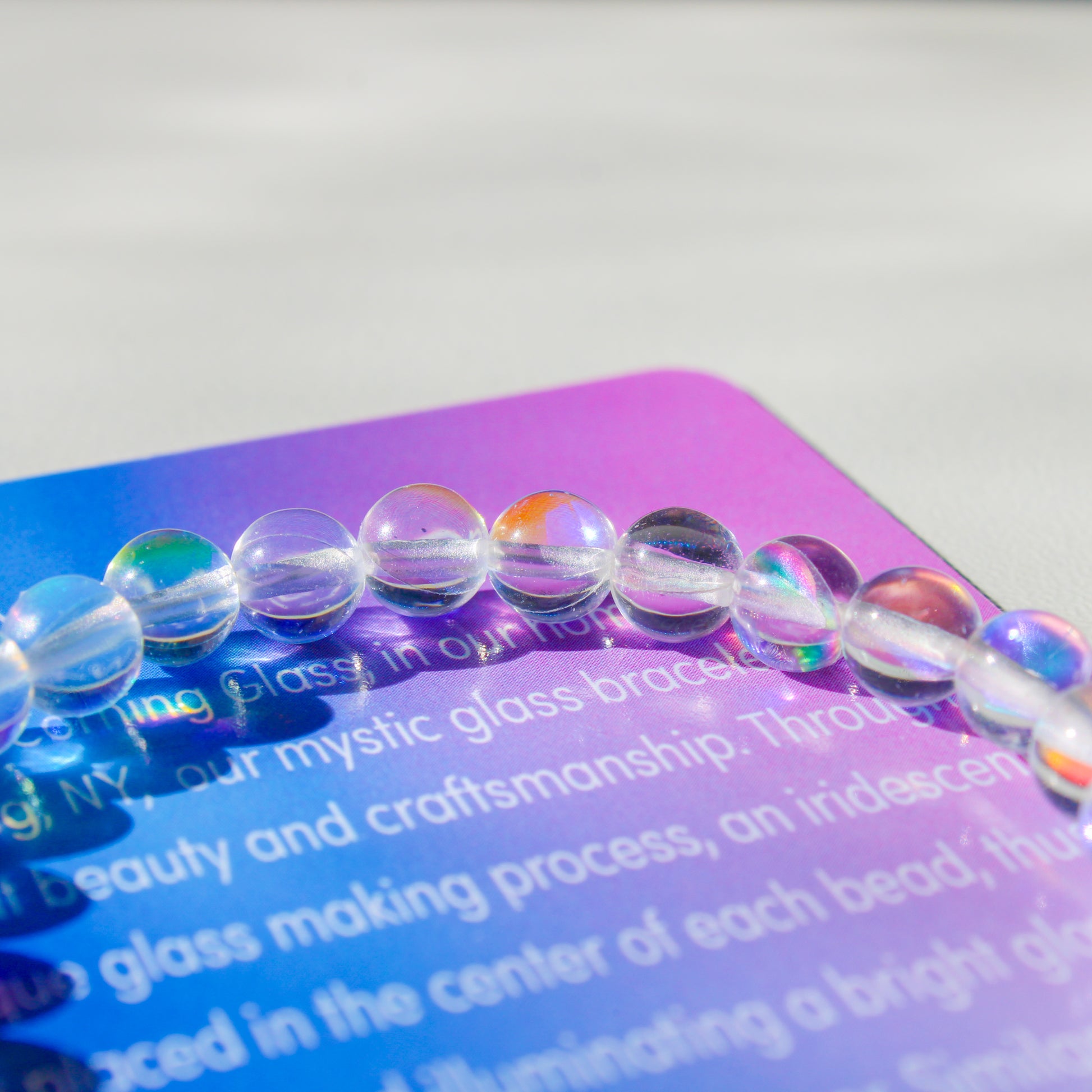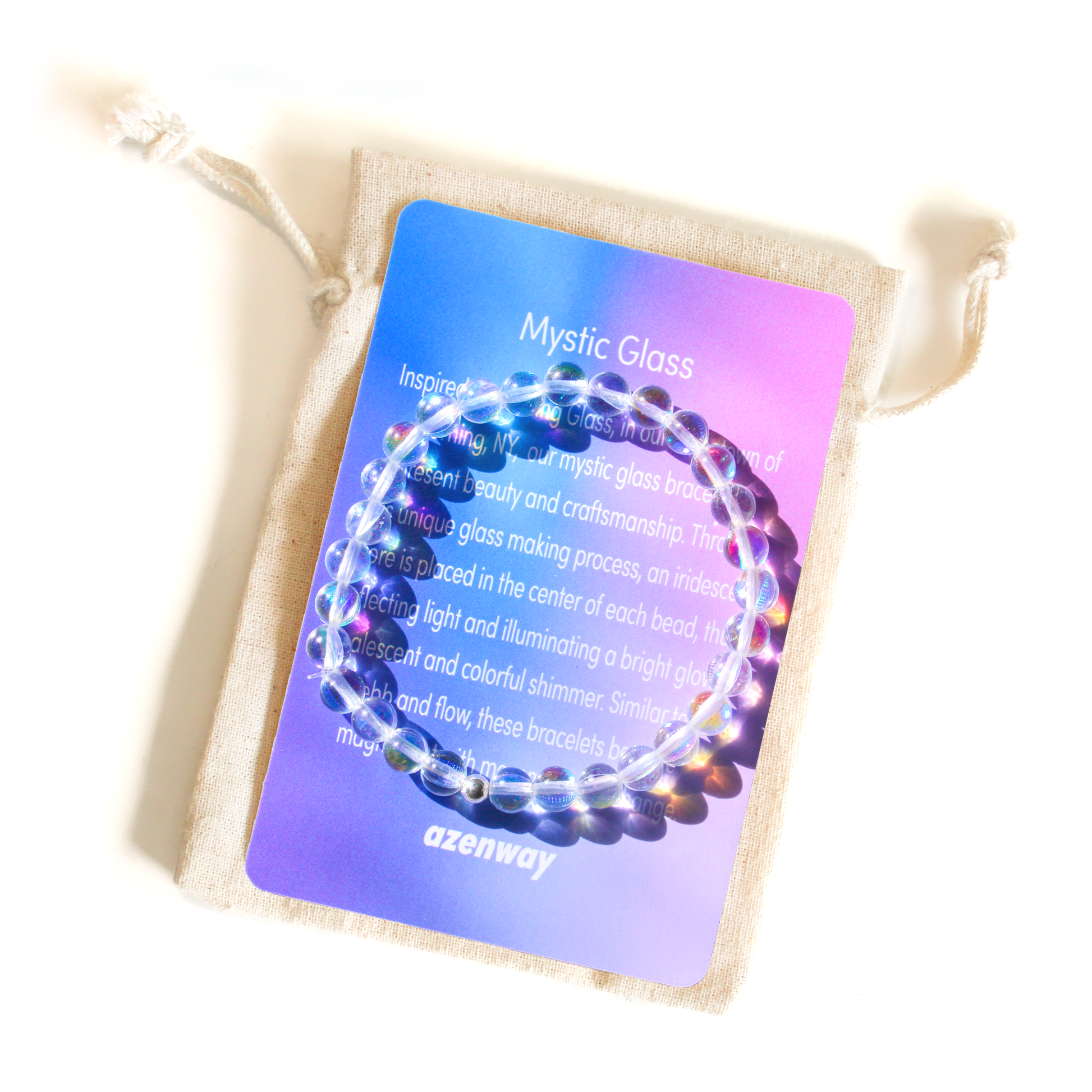 ✨ Mystic Glass: Inspired by Corning Glass, in our hometown of Corning, NY, our mystic glass bracelets represent beauty and craftsmanship. Through this unique glass making process, an iridescent core is placed in the center of each bead, thus reflecting light and illuminating a bright glow of opalescent and colorful shimmer. Similar to life's ebb and flow, these bracelets become magnificent with movement and change.