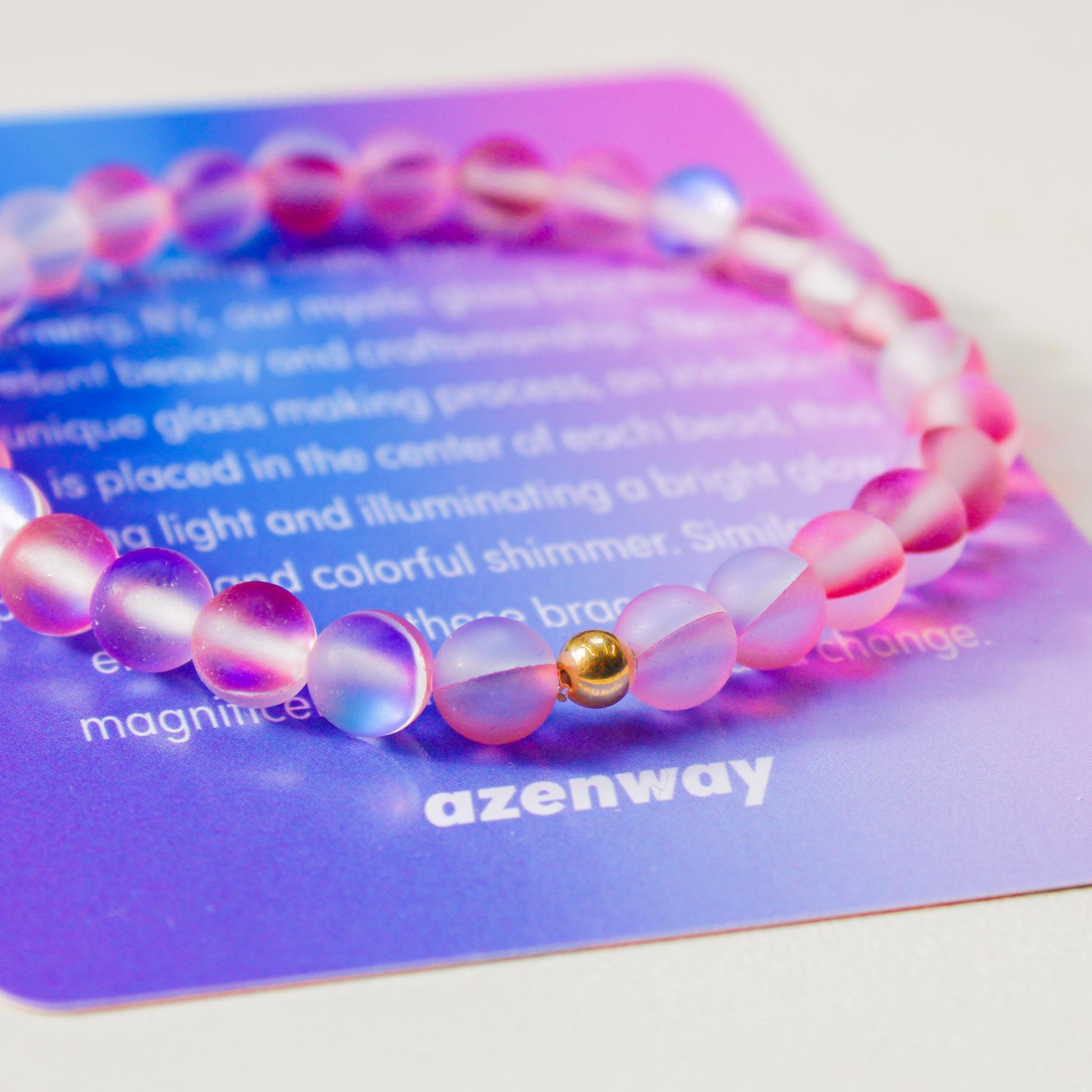 Mystic Glass: Inspired by Corning Glass, in our hometown of Corning, NY, our mystic glass bracelets represent beauty and craftsmanship. Through this unique glass making process, an iridescent core is placed in the center of each bead, thus reflecting light and illuminating a bright glow of opalescent and colorful shimmer. Similar to life‘s ebb and flow, these bracelets become magnificent with movement and change.