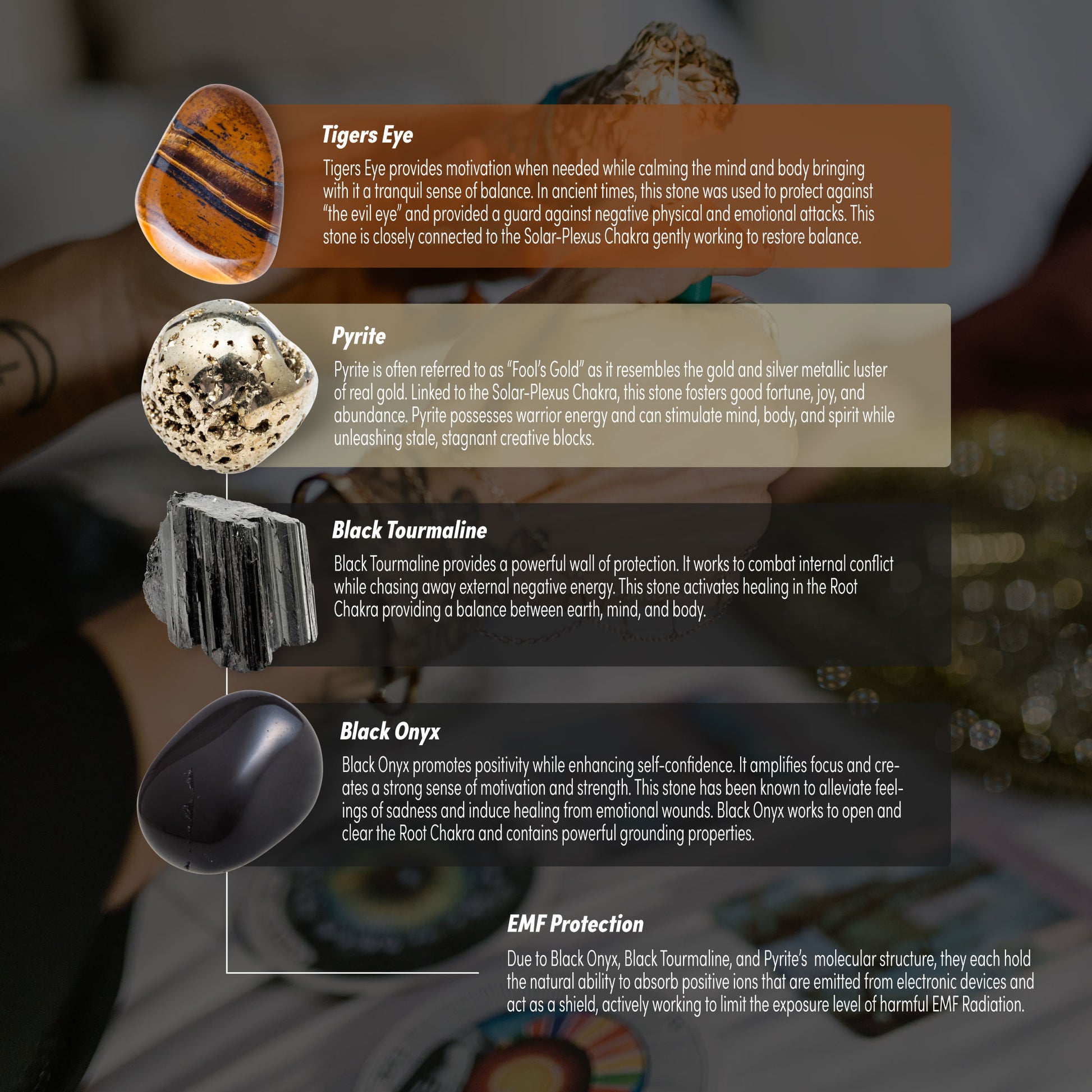 • Pyrite – A powerful stone for deflecting negative energy and enhancing confidence and willpower.