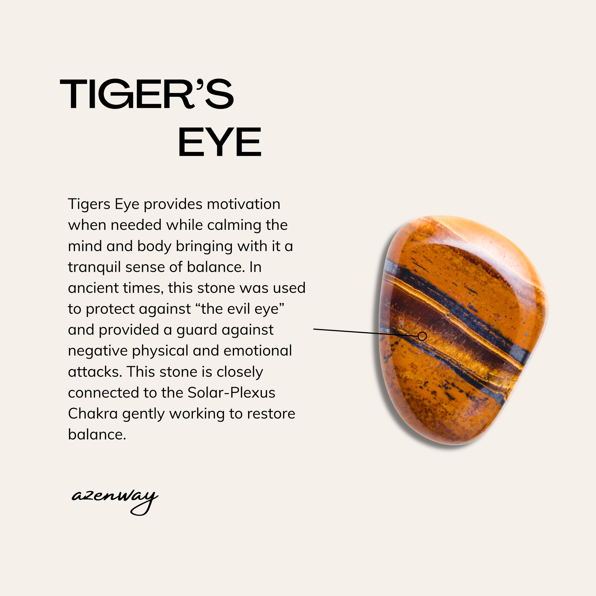 đ TIGER'S EYE - Tigers Eye provides motivation when needed while calming the mind and body bringing with it a tranquil sense of balance. In ancient times, this stone was used to protect against âthe evil eyeâ and provided a guard against negative physical and emotional attacks. This stone is closely connected to the Solar-Plexus Chakra gently working to restore balance.
