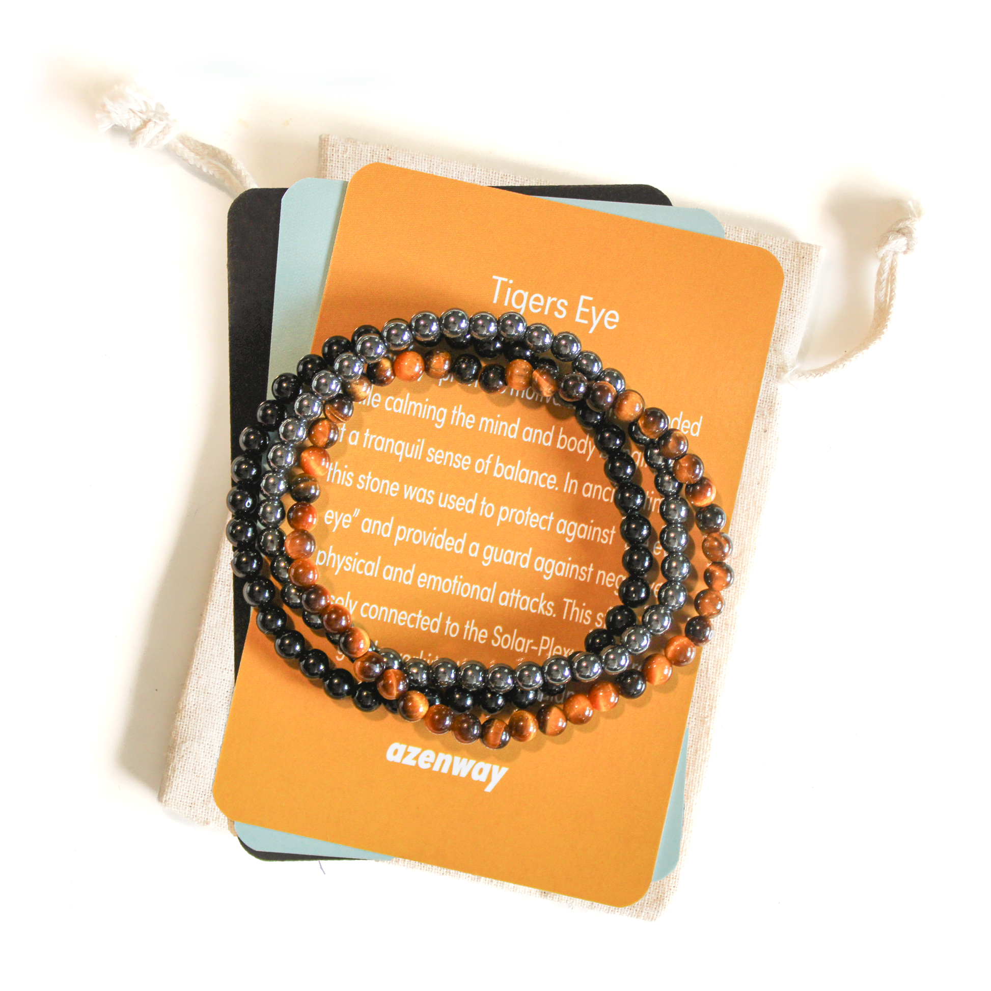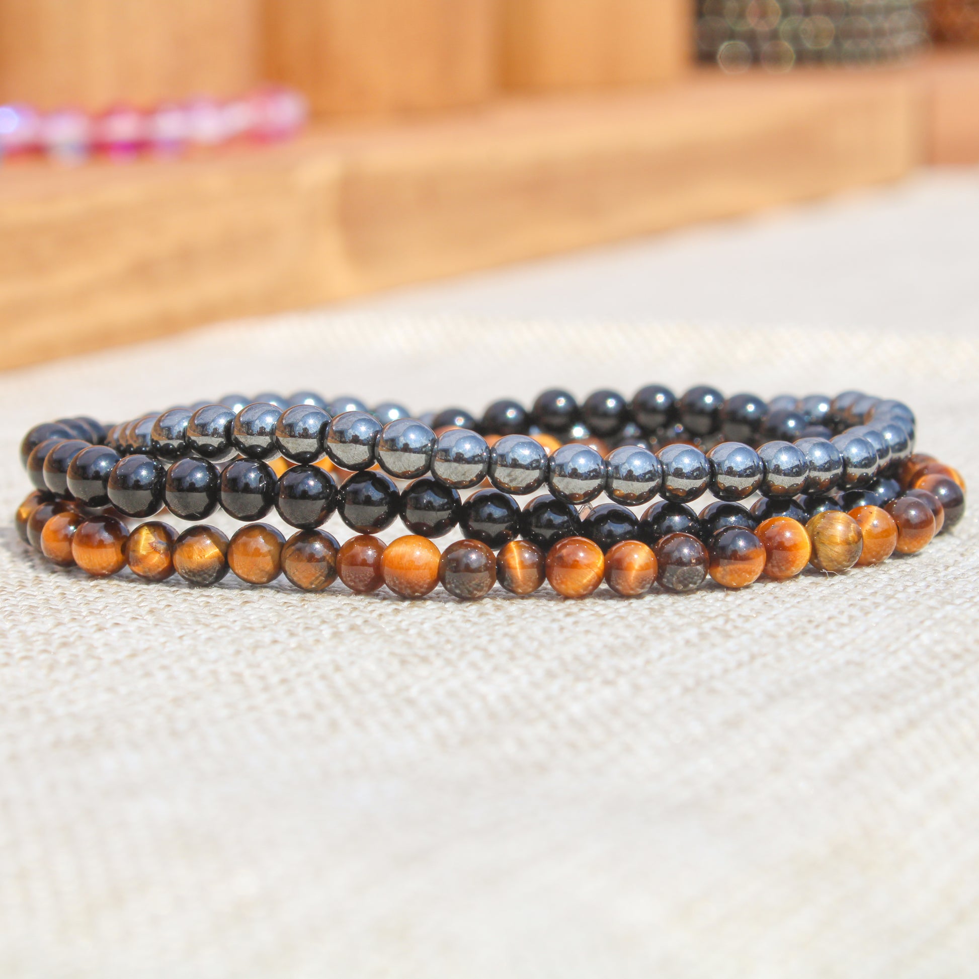 Triple Protection Bracelet - Tiger's Eye, Hematite & Black Tourmaline 4mm Natural Gemstones